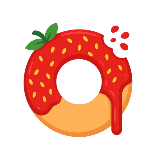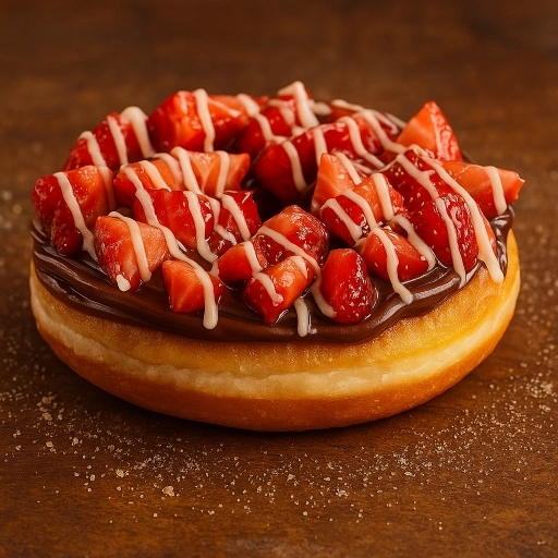 Donuts coberto de chocolate ao leite, morango em cubos e riscos de chocolate branco.