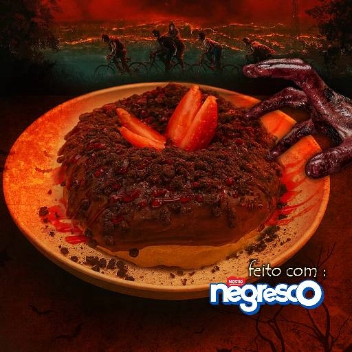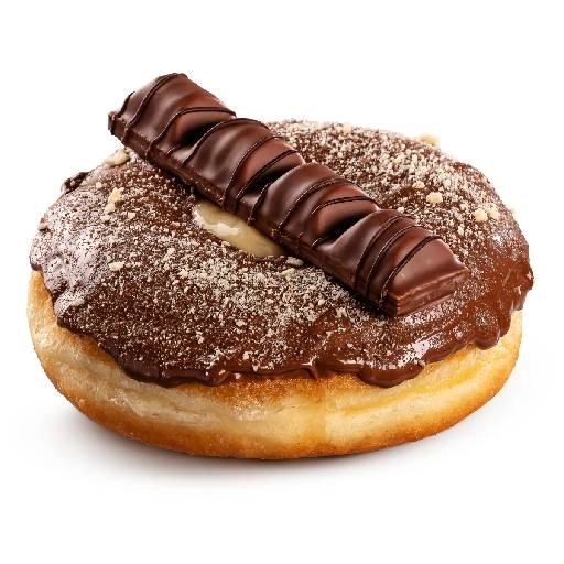Donuts coberto com chocolate ao leite, farofa crocante de Negresco, miolo cremoso de avelã e um morango em formato de D... Ver completo