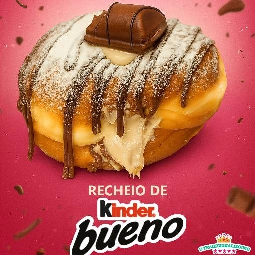 Donuts recheado com o melhor creme do MUNDO sabor KINDER, riscos ao leite polvilhado com leite em pó, pingo de creme ki... Ver completo