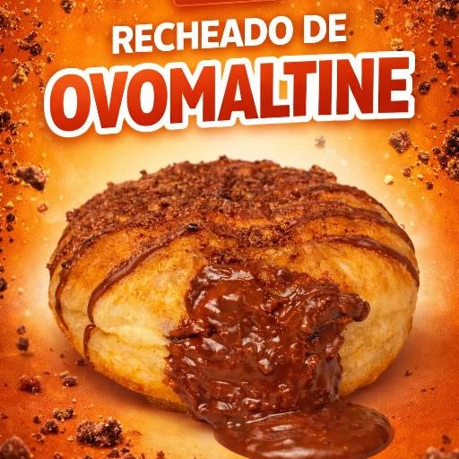 Donuts Recheado de Creme de ovomaltine OFICIAL, coberto de riscos de chocolate ao leite e crocantes de ovomaltine.